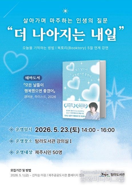 시민행정신문 기자 | 제주시 탐라도서관은 삶과 글을 통해 현대인의 일상 속에서 행복을 발견하고, 스스로를 돌보는 방법을 제시하기 위해 5월 북토리 강연을 운영한다.