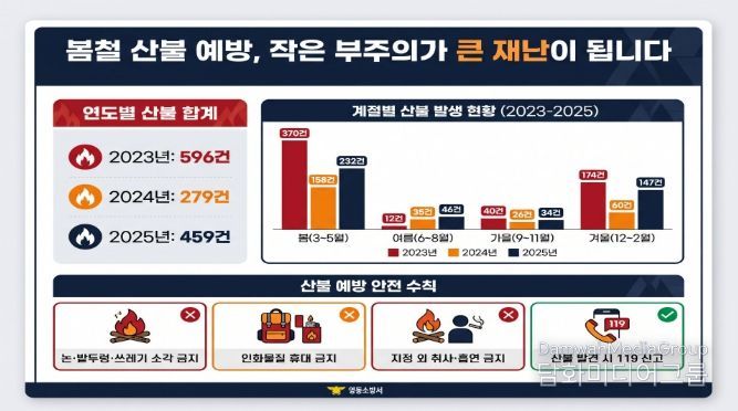 이에 따라 소방서는 △논·밭두렁 및 쓰레기 소각 금지 △입산 시 인화물질 휴대 금지 △지정된 장소 외 취사·흡연 금지 △산불 발견 시 즉시 119 신고 등 기본 안전수칙 준수를 강조했다.