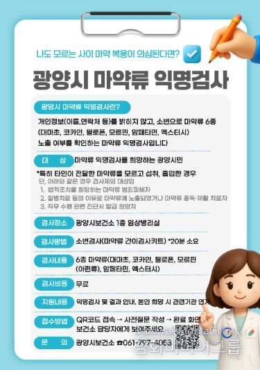 검사 대상은 마약류 노출이 의심되거나 검사를 희망하는 광양시민이다. 검사 비용은 무료이며, 이름을 밝히지 않고 익명으로 받을 수 있다.