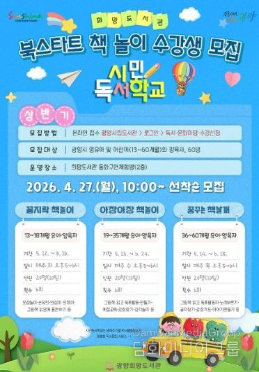 시민행정신문 강갑수 기자 | 광양희망도서관은 ‘2026년 상반기 시민독서학교’의 일환으로 영유아 대상 ‘북스타트 책놀이’ 프로그램 수강생을 모집하고 있다.
