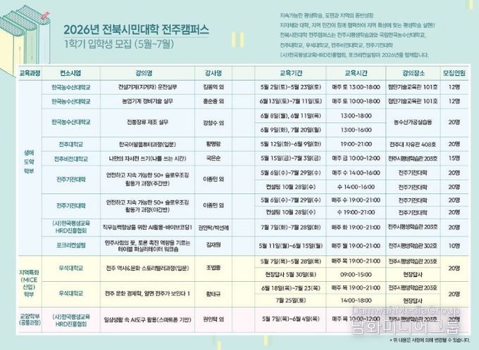 또한 MICE 산업과 연계한 지역특화학부에서는 △직무능력 향상을 위한 AI 활용-바이브코딩1 △테이블 퍼실리테이터 워크숍 △전주 역사문화 스토리텔러과정 △전주 문화 경제학 등이 마련된다.