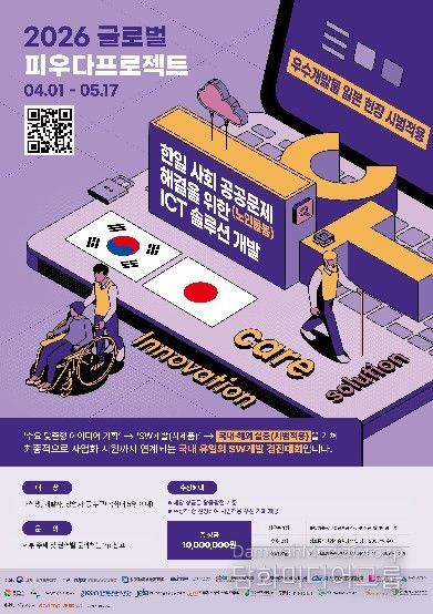 먼저 오는 5월 17일 접수를 마감하는 ‘2026 글로벌 피우다 프로젝트’는 과학기술정보통신부가 주최하고 정보통신산업진흥원과 전국 ICT 콤플렉스 운영기관이 공동 주관하는 글로벌 SW 개발 경진대회로, 한국과 일본의 사회문제(노인돌봄) 해결을 위한 ICT 솔루션 개발을 목표로 아이디어 기획부터 시제품 개발, 국내외 실증까지 전 과정을 지원한다.