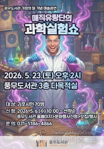 시민행정신문 기자 | 김포시 풍무도서관에서는 5월 23일 오후 2시부터 3시까지 마술공연 ‘매직유랑단의 과학실험쇼’를 운영한다. 가정의 달을 맞아 도서관 이용 가족에게 특별한 문화 향유 기회를 제공하고자 기획된 공연이다.