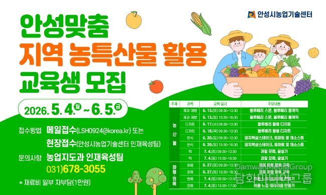 시민행정신문 강갑수 기자 | 안성시농업기술센터는 지역 농산물을 활용한 실습 교육을 통해 소비를 촉진하고 ‘지산지소(지역에서 생산된 농산물을 지역에서 소비함)’ 문화를 활성화하고자, 오는 5월 4일부터 6월 5일까지 교육생을 모집한다고 밝혔다.