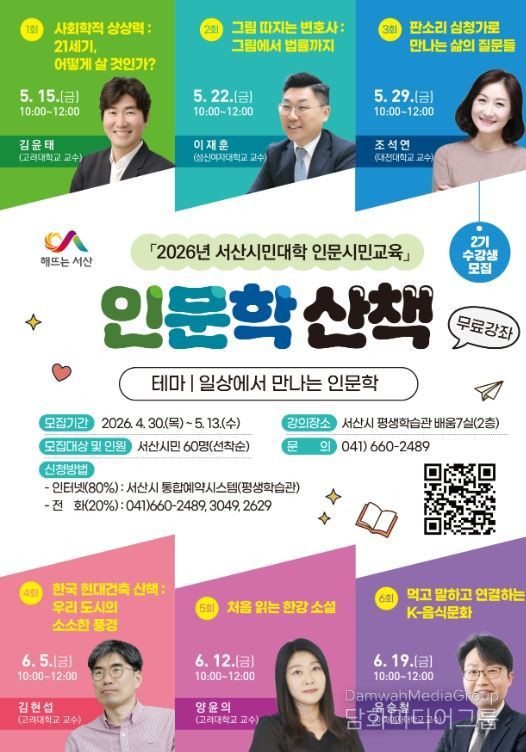 성기영 평생교육과장은 "인문학은 어렵고 멀리 있는 학문이 아니라, 우리 삶을 이해하는 또 하나의 방법"이라며 "이번 강의를 통해 일상 속에서 새로운 의미를 발견하고, 삶의 깊이를 더하는 계기가 되길 바란다"고 말했다.