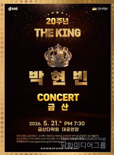 시민행정신문 강갑수 기자 | 금산다락원은 대한민국 트로트계를 대표하는 가수 박현빈의 데뷔 20주년을 기념한 콘서트 ‘더 킹(THE KING)’을 오는 5월 21일 오후 7시 30분 금산다락원 생명의 집 대공연장에서 개최한다.