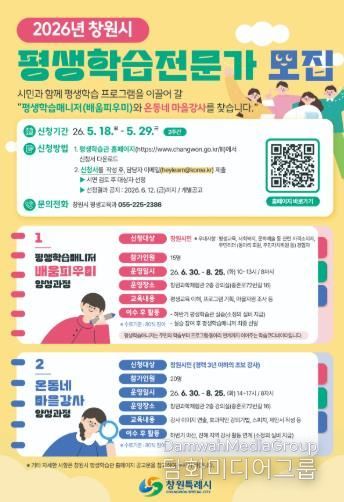시민행정신문 강갑수 기자 | 창원특례시는 시민이 주도하는 평생학습 환경 조성을 위해 ‘2026년 창원시 평생학습전문가 양성과정’을 운영하고, 평생학습매니저 ‘배움피우미’와 온동네 마을강사를 공개 모집한다고 밝혔다.