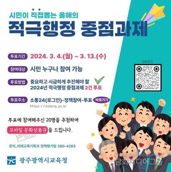 시민행정신문 김지은 기자 | 광주시교육청이 3월 4일부터 13일까지 시민 누구나 참여 가능한 온라인 투표로 ‘2024년 적극행정 중점과제’를 선정한다.