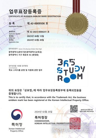 시민행정신문 김지은 기자 | 광주시교육청이 광주교육 정책 대표 브랜드인 학생 눈높이 공부방 ‘365-스터디룸’을 특허청에 업무표장 등록 완료했다고 3일 밝혔다.