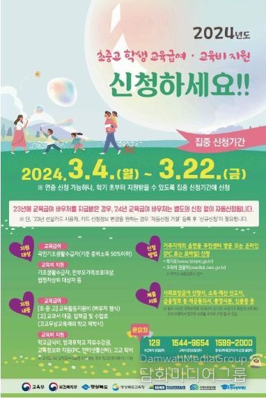 시민행정신문 김지은 기자 | 경북교육청(교육감 임종식)은 저소득층 학생의 교육 기회 보장과 가구의 교육비 부담 경감을 위해, ‘교육급여’와 ‘교육비’ 지원 집중 신청 기간을 4일부터 22일까지 운영한다.