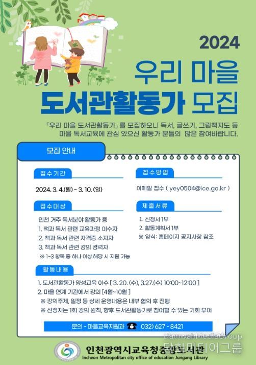 시민행정신문 김지은 기자 | 인천광역시교육청중앙도서관은 인천에 거주하는 도서관과 독서활동가를 대상으로 마을교육기관에서 읽걷쓰와 연계한 다양한 독서교육 활동을 전개하며 도서관과 함께 성장할 '우리마을 도서관활동가' 4기를 4일부터 10일까지 모집한다.
