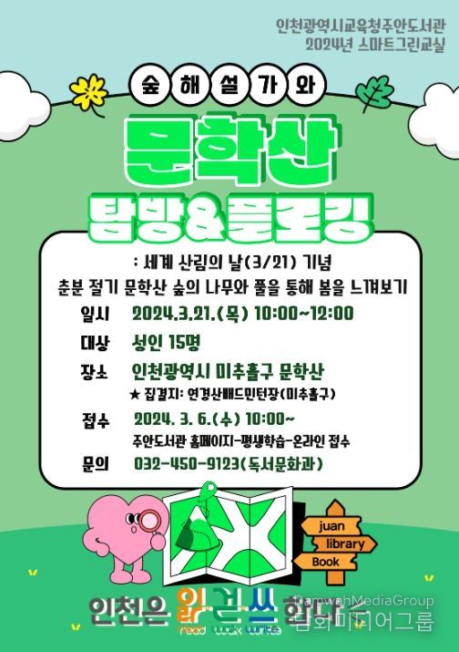 시민행정신문 김지은 기자 | 인천광역시교육청주안도서관은 도서관 특색사업인 스마트그린교실의 일환으로 『숲해설가와 문학산 탐방 플로깅』 프로그램을 21일 오전 10시부터 12시까지 문학산에서 운영한다.