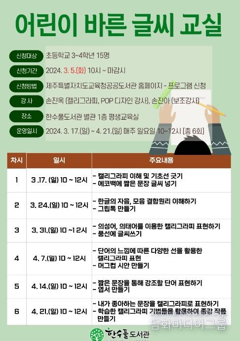시민행정신문 김지은 기자 | 제주도교육청 한수풀도서관은 지역 어린이들이 글쓰기에 대한 재미를 찾는 데 도움을 주고자‘2024년 어린이 바른 글씨 교실’을 운영할 예정이다.