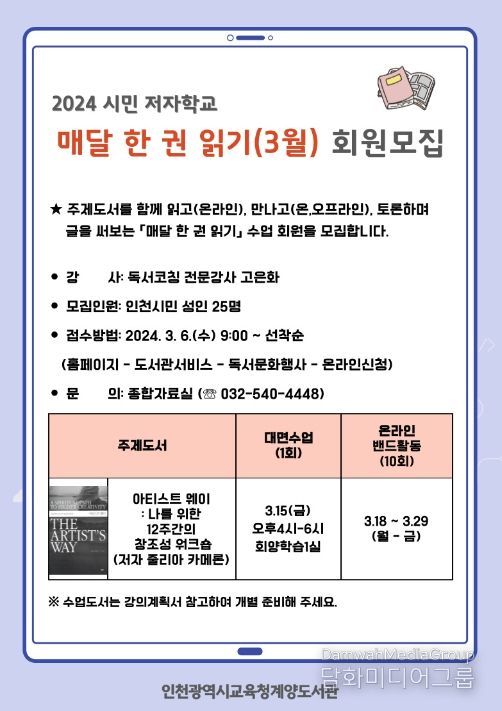 시민행정신문 김지은 기자 | 인천광역시교육청계양도서관은 인천시민 중 성인을 대상으로 2024년 시민저자학교 '매달 한 권 읽기' 프로그램을 3월부터 11월까지 운영한다.