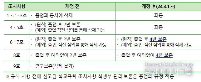 첫째, 올해 3월 1일부터 신고‧접수된 학교폭력 사안부터, 중대한 학교폭력을 일으킨 가해 학생의 학교폭력 조치 중 출석정지(6호), 학급교체(7호), 전학(8호) 조치의 학교생활기록부 기록 보존기간을 졸업 후 2년에서 4년으로 연장한다.