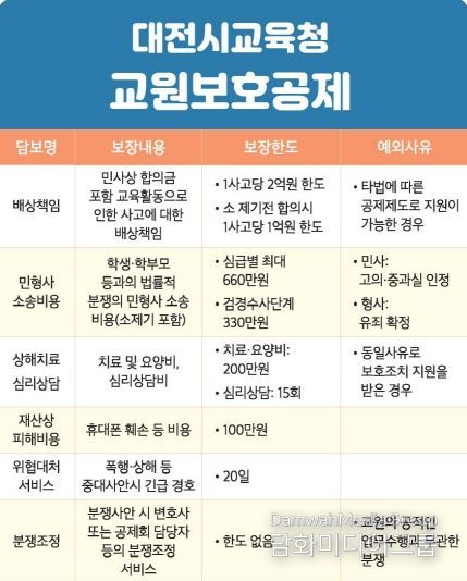 시민행정신문 김지은 기자 | 대전광역시교육청은 교원의 정당한 교육활동을 보호하기 위해 2018년부터 운영해 온 교원배상 책임보험의 보장범위를 확대해 '2024년 교원보호공제 사업'으로 개선한다고 밝혔다.