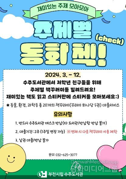 시민행정신문 기자 | 부천시 수주도서관은 3월 15일부터 어린이 대상 주제별 책꾸러미 대출 서비스인 ‘주제별 동화첵(check)’을 운영한다.