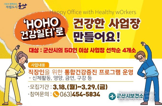 시민행정신문 강갑수 기자 | 군산시 보건소는 3050세대의 주 생활터인 사업장을 대상으로 통합건강증진 프로그램을 운영하는 ‘HOHO 건강일터’ 사업 대상 사업장 모집을 시작한다.