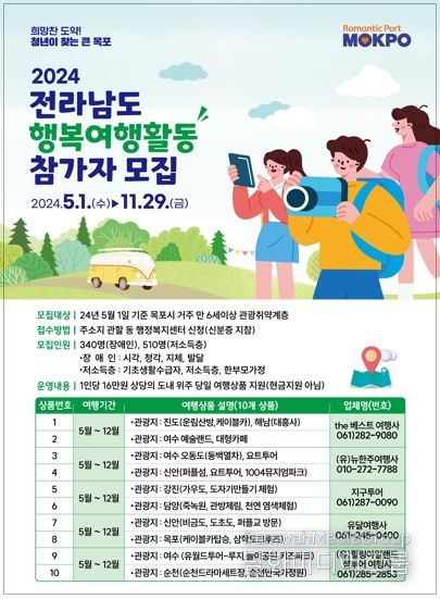 시민행정신문 강갑수 기자 | 목포시는 여행기회가 적은 장애인 및 저소득층 등 관광 취약계층의 관광기본권을 보장하고 지역 관광 산업 활성화를 위해‘2024년 전라남도 행복여행 지원사업’참가자를 모집한다고 밝혔다.