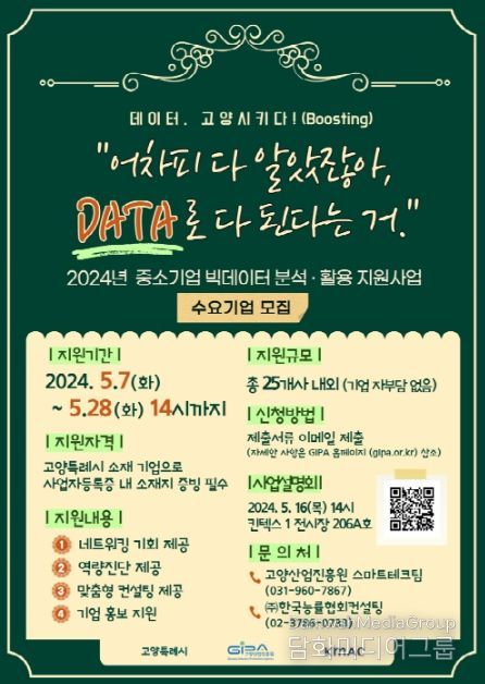 시민행정신문 강갑수 기자 | 고양특례시와 고양산업진흥원은 5월 28일까지 ‘2024년 중소기업 빅데이터 분석·활용 지원사업’에 참여할 관내 수요기업을 모집한다고 밝혔다.