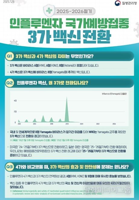 이번 2025-2026 절기 인플루엔자 예방접종부터 세계보건기구(WHO)의 권고사항과 예방접종전문위원회 심의에 따라 기존 4가 백신에서 3가 백신으로 전환해 시행된다.