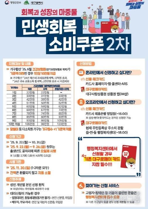 시민행정신문 이세훈 기자 | 대구광역시는 정부의 민생회복 소비쿠폰 2차 지급기준이 확정됨에 따라 세부 지급계획을 마련하고, 소득 기준을 충족하는 대구 시민 215만 1천 명(91.3%)을 대상으로 9월 22일부터 1인당 10만 원씩, 2,151억 원 규모의 소비쿠폰 2차 신청·접수를 시작한다.