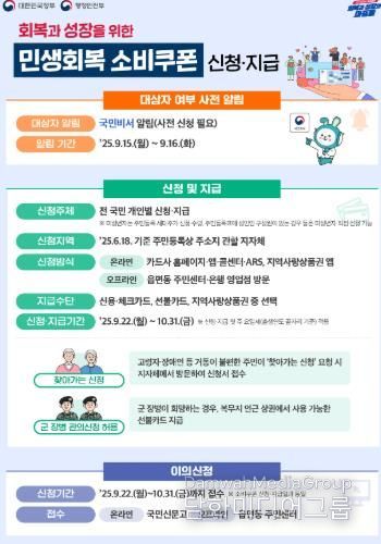 김명구 경제과장은 “이번 2차 민생회복 소비쿠폰이 명절과 연말을 앞두고 시민들의 생활 안정에 작은 보탬이 되길 바란다”며 “신청 기간과 방법을 꼭 확인하시고, 많은 시민들이 혜택을 받을 수 있도록 적극 참여해 달라”고 말했다.
