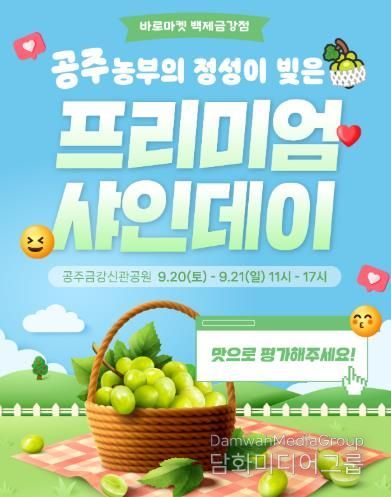 시민행정신문 이세훈 기자 | 공주시 지역 포도 농가들이 오는 20일과 21일 이틀 동안 금강신관공원 내 바로마켓 백제금강점에서 ‘프리미엄 샤인데이’ 행사를 연다.