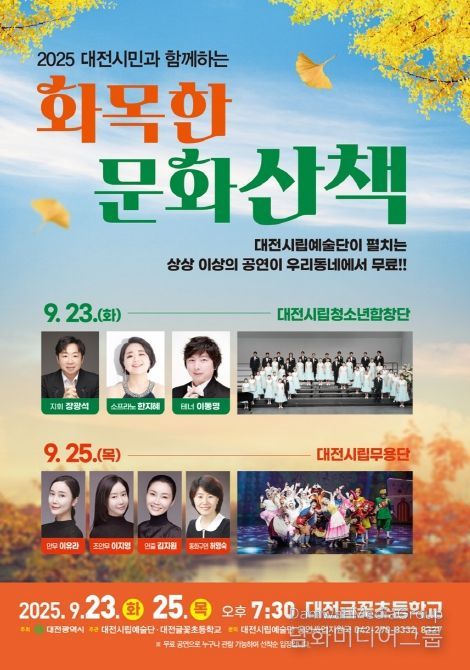 대전시립예술단은 오는 9월 23일과 25일 저녁 7시 30분, 대전글꽃초등학교 강당에서 ‘화목한 문화산책’ 공연을 연다.