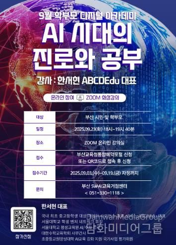 시민행정신문 기자 | 부산광역시교육청교육연구정보원 SW‧AI교육거점센터는 오는 23일 오후 6시 온라인 원격 연수를 통해 관내 학부모를 대상으로 ‘9월 학부모 디지털 아카데미’를 실시한다.