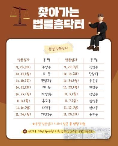 시민행정신문 강갑수 기자 | 대전 동구는 구민들의 생활 속 법률 고민을 해소하기 위해 ‘법률홈닥터 찾아가는 무료 법률상담 서비스’를 운영한다고 18일 밝혔다.