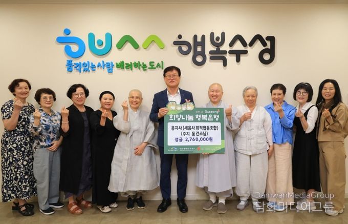 시민행정신문 강갑수 기자 | 대구 수성구는 지난 19일 용지사(세음사회적협동조합) 주지 동건스님과 신도들이 재난 피해 주민들을 위해 써달라며 성금 276만 원을 전달했다고 밝혔다.