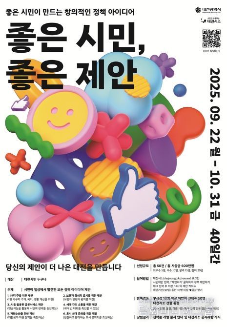 시민행정신문 강갑수 기자 | 대전시는 시민참여 플랫폼 ‘대전시소’를 통해 9월 22일부터 10월 31일까지 40일간 《좋은 시민, 좋은 제안》 공모를 실시한다.