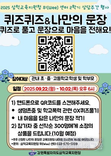 시민행정신문 기자 | 삼척교육지원청 위(Wee)센터에서는 9월 22일에서 10월 2일까지 진행되는 ‘2학기 상담주간’을 맞아, 학생 참여형 심리 프로그램인 ‘퀴즈퀴즈&나만의 문장’을 새롭게 운영한다고 밝혔다.