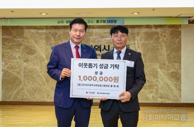 시민행정신문 강갑수 기자 | 대구광역시 옥외광고협회 황태하 전 회장은 지난 22일 대구 중구청을 방문해 추석을 맞아 어려운 이웃을 위한 성금 100만 원을 전달했다.