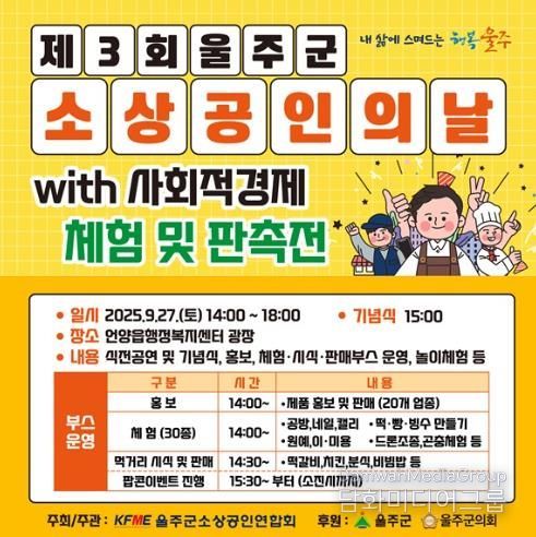 시민행정신문 강갑수 기자 | 울주군 소상공인연합회가 오는 27일 오후 2시부터 6시까지 언양읍 행정복지센터 광장에서 ‘제3회 울주군 소상공인의 날’ 행사를 개최한다고 23일 밝혔다.