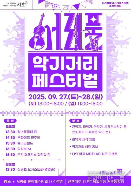 시민행정신문 이존영 기자 | 서울 서초구는 '2025 서리풀뮤직페스티벌' 기간인 오는 27일부터 28일까지 반포대로 일대에서 ‘제7회 서리풀 악기거리 축제’를 개최한다고 밝혔다. ‘서리풀 악기거리 축제 추진단’이 주최·주관하는 이번 축제는 국내 유일 음악문화지구인 서리풀 악기거리에서 구의 악기거리 인프라를 활용해 모두가 함께 만들어 가는 문화축제다.