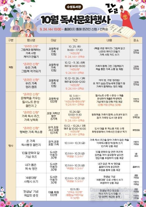 또, 10월 문화의 달을 기념하여 ▲문해력 필사노트 완성 챌린지, ▲문화의 달 기념 퀴즈, ▲내가 뽑은 책 속 한 구절, ▲세종대왕 사행시 쓰기 등 다양한 추첨 경품 행사도 함께 진행된다.