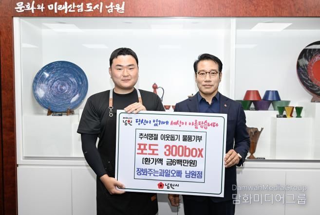 최경식 남원시장은 “장봐주는과일오빠 남원점이 추석 명절을 맞아 취약계층을 위한 기부를 이어가고 있는 점에 깊은 감사의 말씀을 드린다”라면서 “이와 같은 상생 정신은 남원의 복지 향상에 큰 도움이 되고 있다. 앞으로도 지역 경제와 사회의 발전을 위해 함께 협력해 나가기를 바란다”라고 전했다.