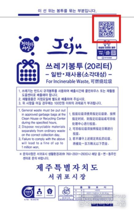 시민행정신문 김학영 기자 | 서귀포시는 QR코드가 인쇄된 가연성 종량제 봉투(20L) 4만 5천 매를 1차로 제작하여 9월 8일부터 편의점·소매점 및 대형마트 등 판매업체(632개소)에 공급을 시작했다.