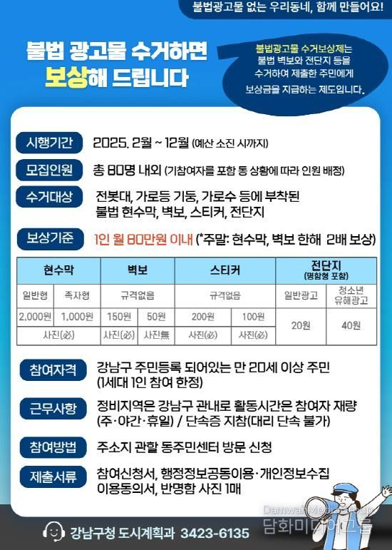 보상금은 월 최대 80만 원 한도에서 현수막 1장당 1,000~2,000원, 벽보 50~150원, 스티커 100~200원, 전단지 20~40원이 지급된다. 주말에는 현수막과 벽보에 한해 평일의 2배 금액이 적용된다. 정비는 강남구 관내에서 이뤄지며, 활동 시간은 개인 일정에 맞춰 탄력적으로 운영된다.
