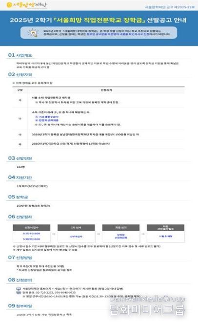 시민행정신문 이존영 기자 | 서울장학재단은 경제적인 부담으로 학업을 이어가기 어려운 직업전문학교 재학생을 지원하기 위해 '서울희망 직업전문학교 장학금' 2025년 2학기 장학생을 모집한다. 모집 기간은 9월 17일 오전 10시부터 30일 오후 4시까지이며, 102명을 선발해 1인당 150만 원의 등록금을 지원한다.