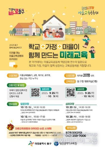 시민행정신문 강갑수 기자 | 대전 동구는 학생들의 행복한 성장을 지원하기 위해 학교와 가정, 지역사회가 하나 돼 협력하는 ‘미래를 여는 마을교육공동체 아카데미’를 개최한다고 25일 밝혔다.