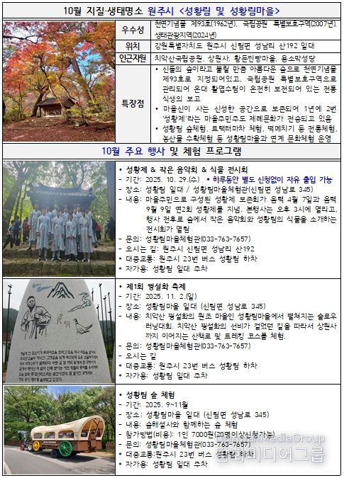 10월에는 성황림과 성황림마을을 중심으로 다양한 가을 프로그램이 운영된다. 마을의 연례행사인 △‘성황제’(10.29.)는 성황제 보존회가 주관하는 전통 제례와 함께 연계 행사로 숲속 작은 음악회, 식물 전시회가 열려 전통과 자연을 함께 체험할 수 있도록 구성됐다.