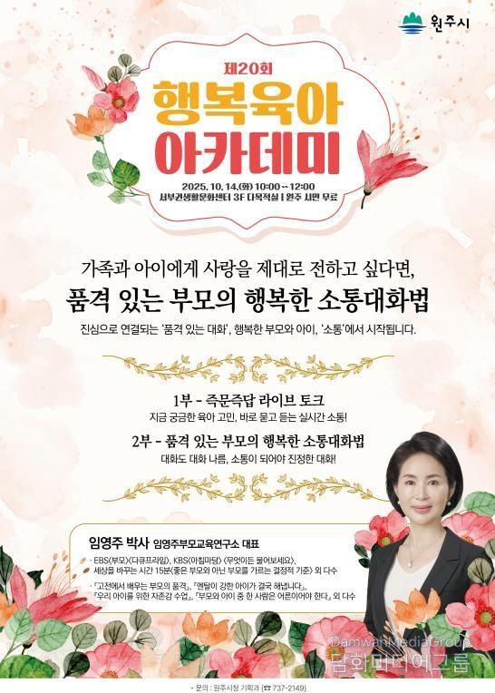 시민행정신문 강갑수 기자 | 원주시는 10월 14일 오전 10시, 서원주생활문화센터 3층 임영주 임영주부모교육연구소 대표와 함께 ‘제20회 행복육아 아카데미’를 개최한다.
