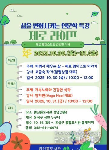 시민행정신문 강갑수 기자 | 대전 유성구는 10월 30일과 31일 이틀간 원신흥도서관에서 ‘삶을 변화시키는 인문학 특강: 제로 라이프’를 운영한다.