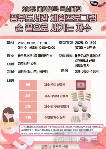 시민행정신문 기자 | 김포시 풍무도서관은 2025 대한민국 독서대전 사업의 일환으로 오는 10월 22일부터 31일까지 총 4회에 걸쳐 수·금요일 오전 10시부터 12시까지 ‘손 끝으로 새기는 자수’를 운영한다.