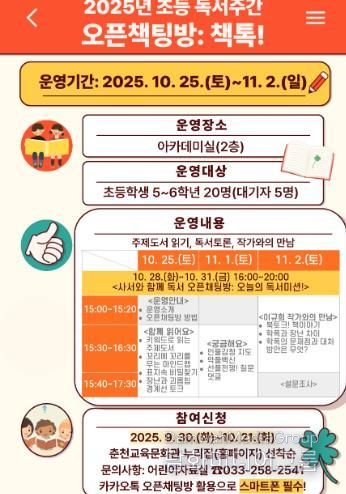 시민행정신문 기자 | 춘천교육문화관은 책 읽기 좋은 계절인 가을을 맞아 오는 10월 25일, 10월 28일부터 11월 2일까지 초등학생 5~6학년 학생 20명을 대상으로 초등 독서주간 ‘오픈책팅방 책톡!’을 운영한다.