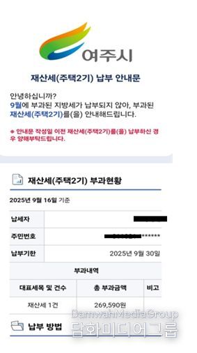 특히 이번 9월 재산세 알림톡에는 단순한 지방세 납부 안내를 넘어 전자문서 하단에 배너를 이용하여 여주시 대표 축제인 “오곡나루 축제” 홍보 동영상을 삽입하여 시민들이 지방세 납부 안내와 함께 축제 정보를 자연스럽게 접할 수 있도록 했다.