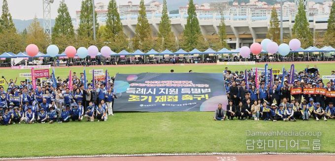행사장 중앙에는 대형 현수막과 풍선, 손피켓, 깃발이 어우러져 열기를 더했으며, 사회자의 선창에 맞춰 참석자 전원은 “비수도권 특례시 기준 완화!”, “특례시 지원 특별법 조기 제정!”, “비수도권 유일한 특례시, 반드시 우리가 지킨다!” 등의 구호를 힘차게 외치며 특례시 지위 사수와 특별법 제정에 대한 강한 의지를 표명했다.
